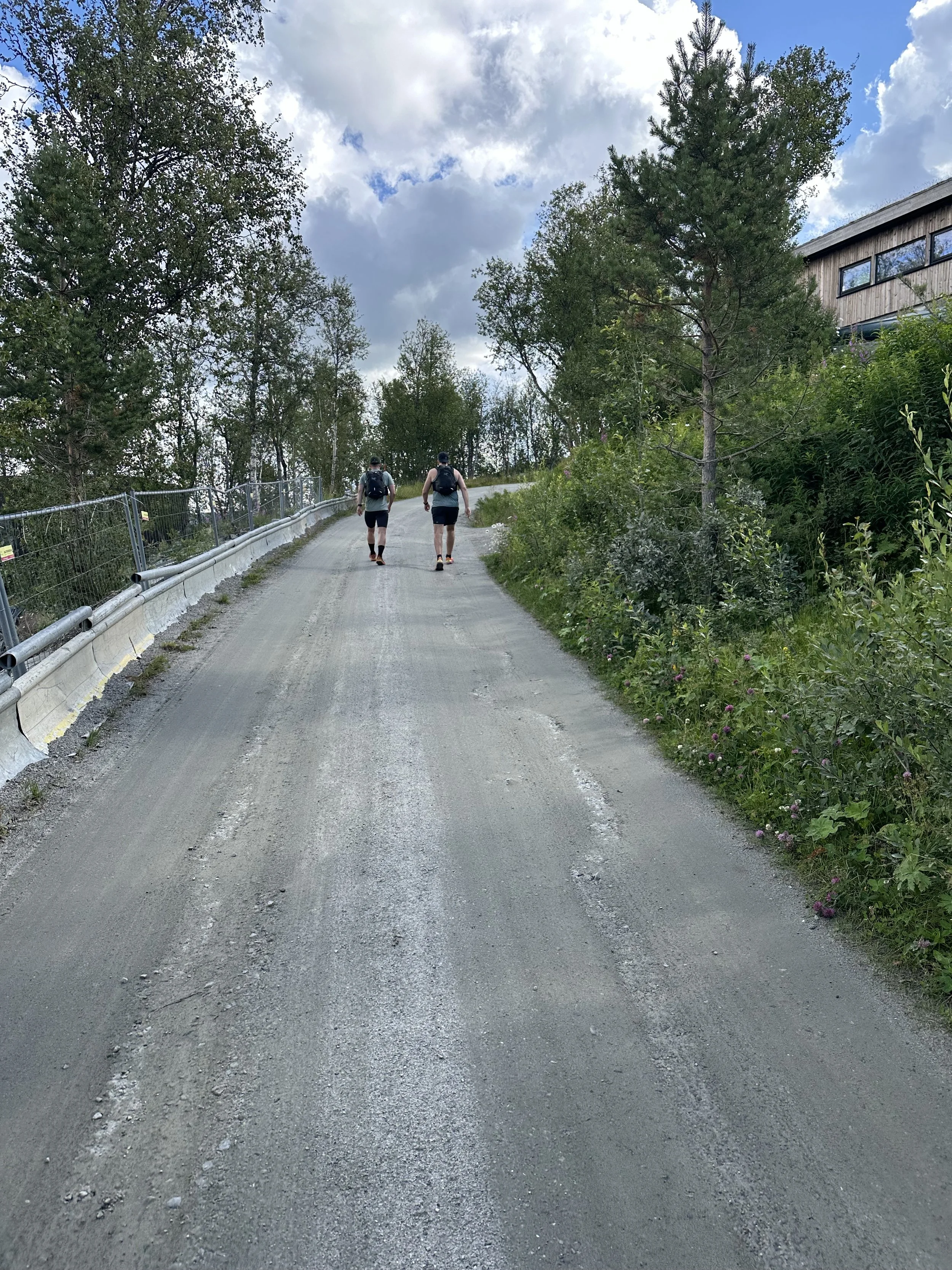 Vi har plottet inn ruten til Tuva og lastet den ned til klokkene våre. Dette fungerer ypperlig til omtrent kilometer 2, hvor vi velger å avvike fra ruten. Vi går heller opp selve alpinbakken enn å følge grusveien rundt. Dette resulterer i våte sko allerede fra første halvtime, men vi sparer sikkert 10 min på manøveren.