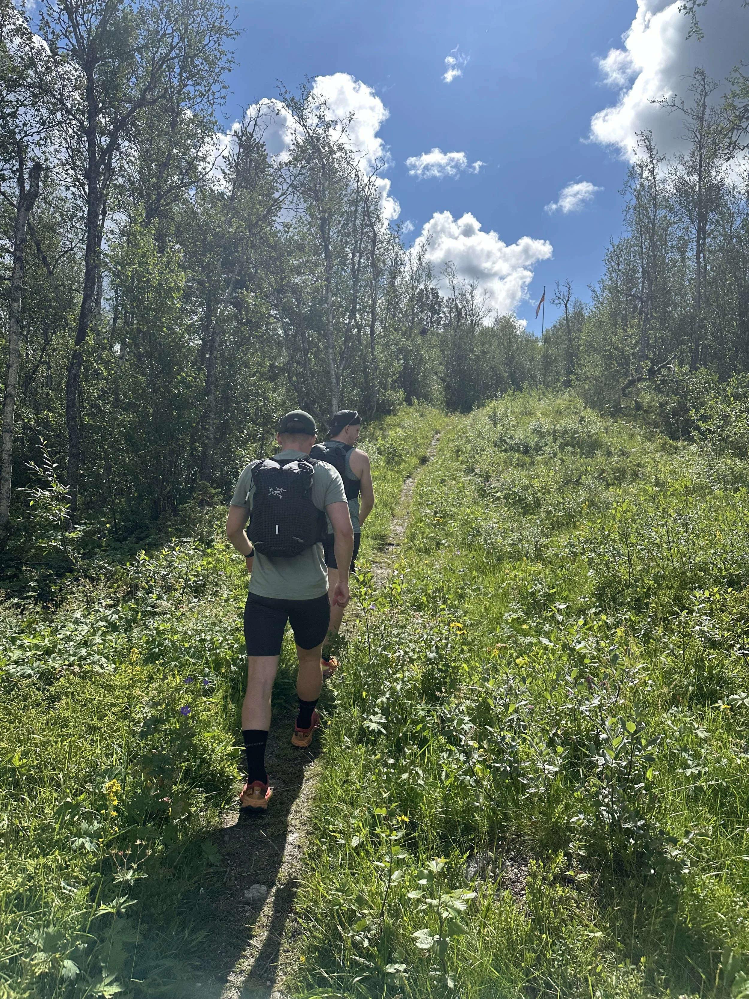 Starten opp alpinbakken er fin, men vi har overtenning og undertegnede mener vi går ut for hardt. Når vi kommer opp selve alpinbakken, smyger terrenget seg videre oppover helt til rundt 14 kilometer hvor det bikker nedover igjen. Muskulaturen liker ikke dette, men mer om det senere. Stiene er generelt gode, men litt steinete.